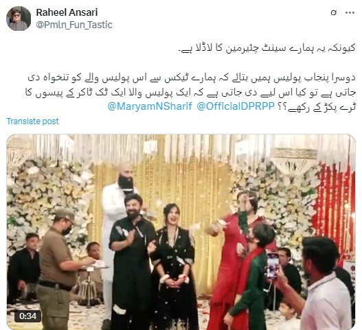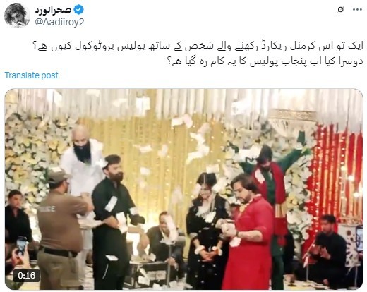 In the widely circulated clip, Kashif Zameer can be seen showering currency notes on a woman, while a uniformed police officer stands nearby, holding a tray containing more money.