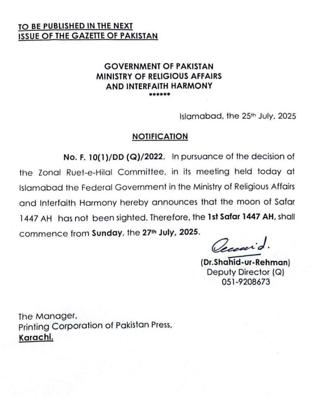As a result, 1st Safar 1447 AH will begin on Sunday, following the completion of 30 days of Muharram.