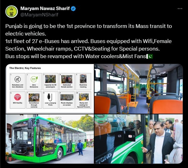 A day earlier, Punjab Chief Minister Maryam Nawaz shared her plan to shift Punjab’s mass transit to electric vehicles, claiming that “Punjab is going to be the first province to transform its mass transit to electric vehicles”.