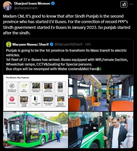 After noticing CM Maryam's claim, Sharjeel Memon attempted to set the record straight, stating, “It’s good to know that after Sindh, Punjab is the second province that has started EV Buses. For the correction of record, PPP’s Sindh government started EV buses in January 2023. So Punjab started after Sindh.”