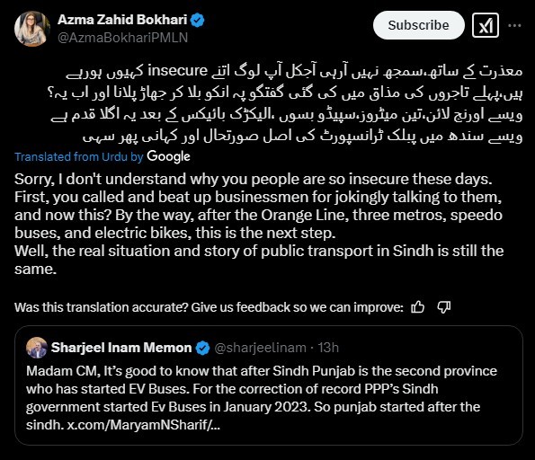 This prompted Sindh’s transport minister Sharjeel Memon to quickly remind her that Sindh had already made this switch to electronic busses back in 2023.