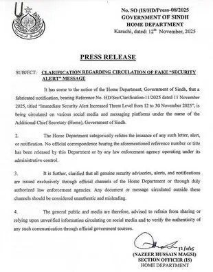 It is pertinent to mention that a fake notification, allegedly issued by the Sindh Home Department, has been circulating on social media, claiming that a high-level security alert had been declared in Karachi from November 12 to November 30, 2025.