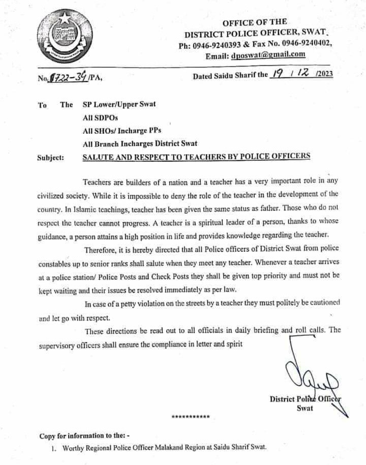 In a commendable move towards acknowledging the pivotal role of teachers in society, Swat District Police Officer (DPO) Shafiullah Gandapur has directed all police officers to "salute and honour" educators across the district.