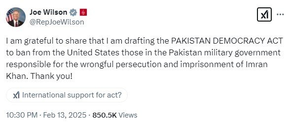 In a letter addressed to US President Donald Trump and Secretary of State Marco Rubio on February 11, Wilson stated that the proposed act would reinforce democratic principles and human rights protections in Pakistan.