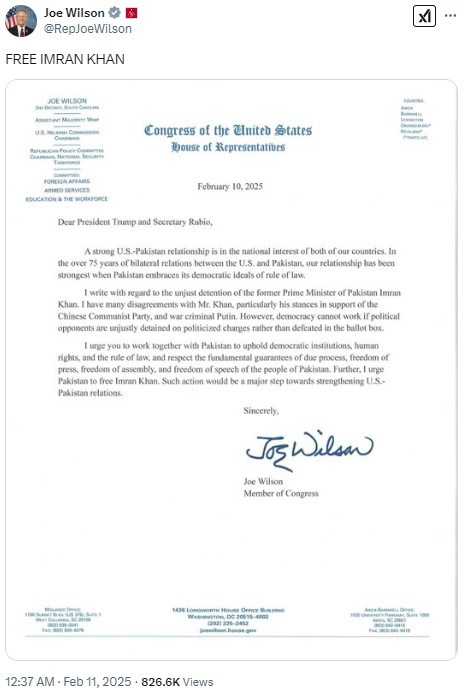 Pakistan’s Interior Minister, Mohsin Naqvi, met with US Congressmen Joe Wilson and Rob Bresnahan in Washington on January 23, 2025. Shortly after the meeting, Congressman Joe Wilson posted "Free Imran Khan" on his X account.