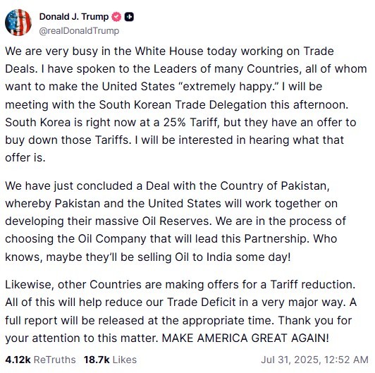 “We have just concluded a deal with the country of Pakistan, whereby Pakistan and the United States will work together on developing their massive oil reserves,” Trump wrote.