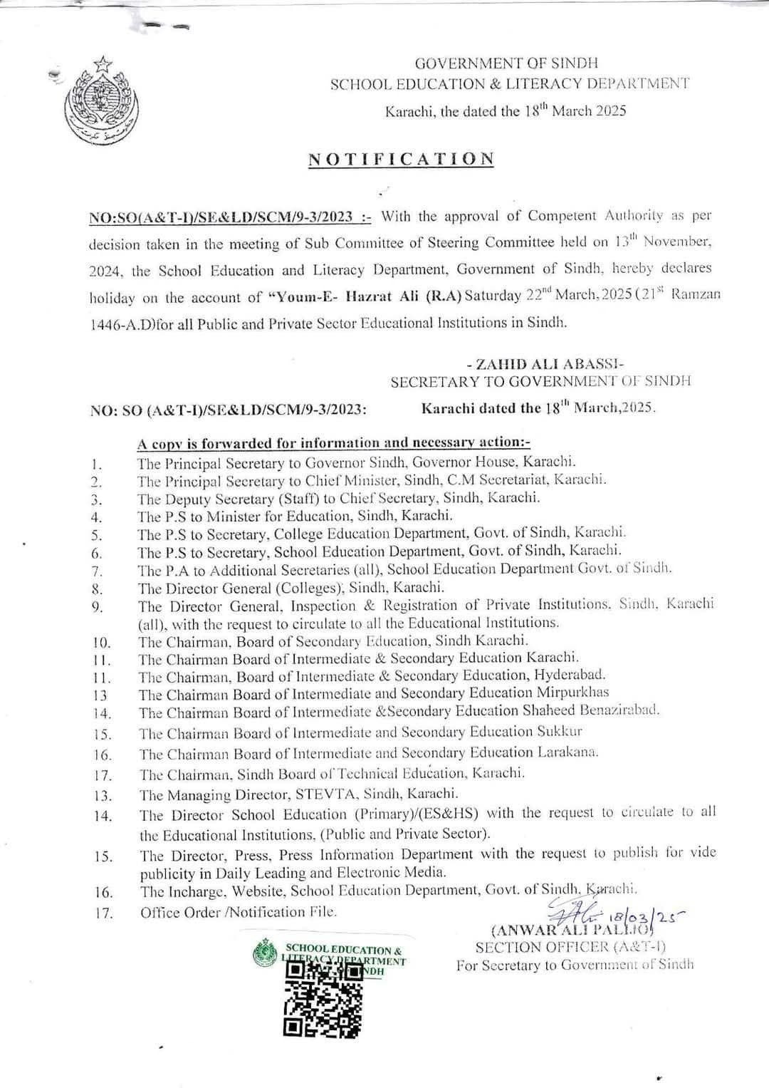 In this regard, a notification has been issued according to which all government and private schools and colleges in Sindh will remain closed on the occasion of the martyrdom of Hazrat Ali (RA).
