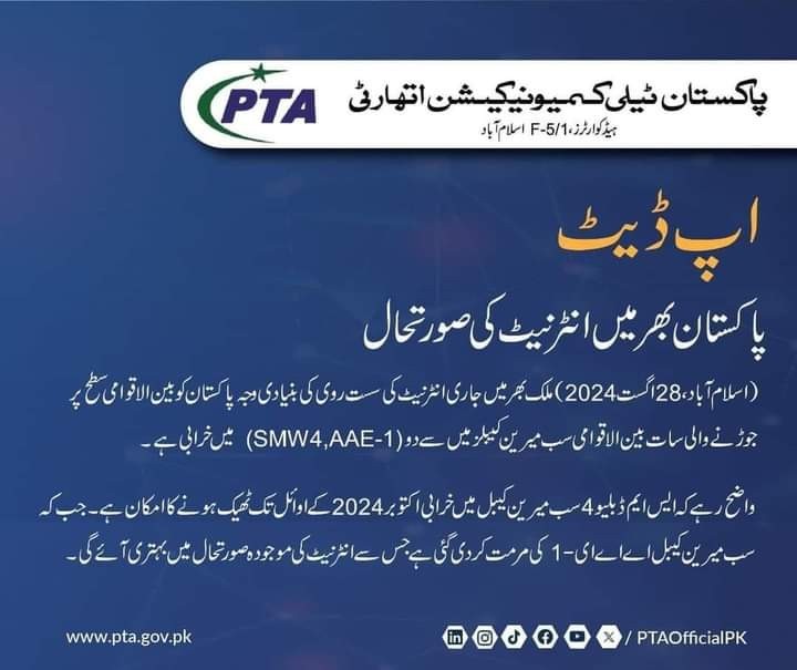 The Pakistan Telecommunication Authority (PTA) said in a statement, adding that fault in SMW-4 submarine cable is likely to be repaired by early October 2024,
