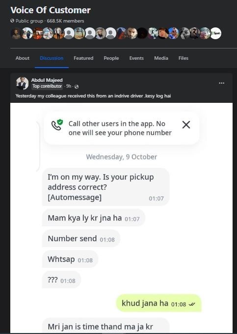 According to a screenshot shared by a social media user Abdul Majeed in the Facebook group "Voice of Customer", the driver, identified as Zeshan, sent inappropriate messages to the woman after she booked a ride on October 9.