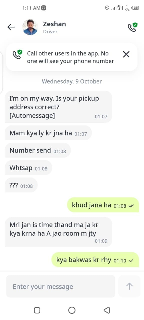 As per the screen grab, the conversation began formally, with the driver asking who would be riding.