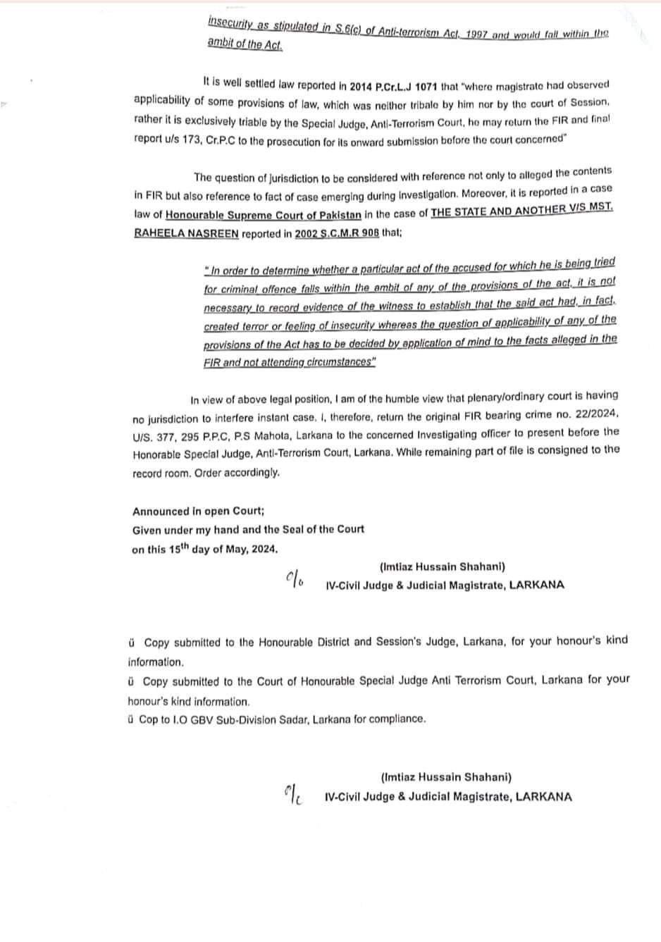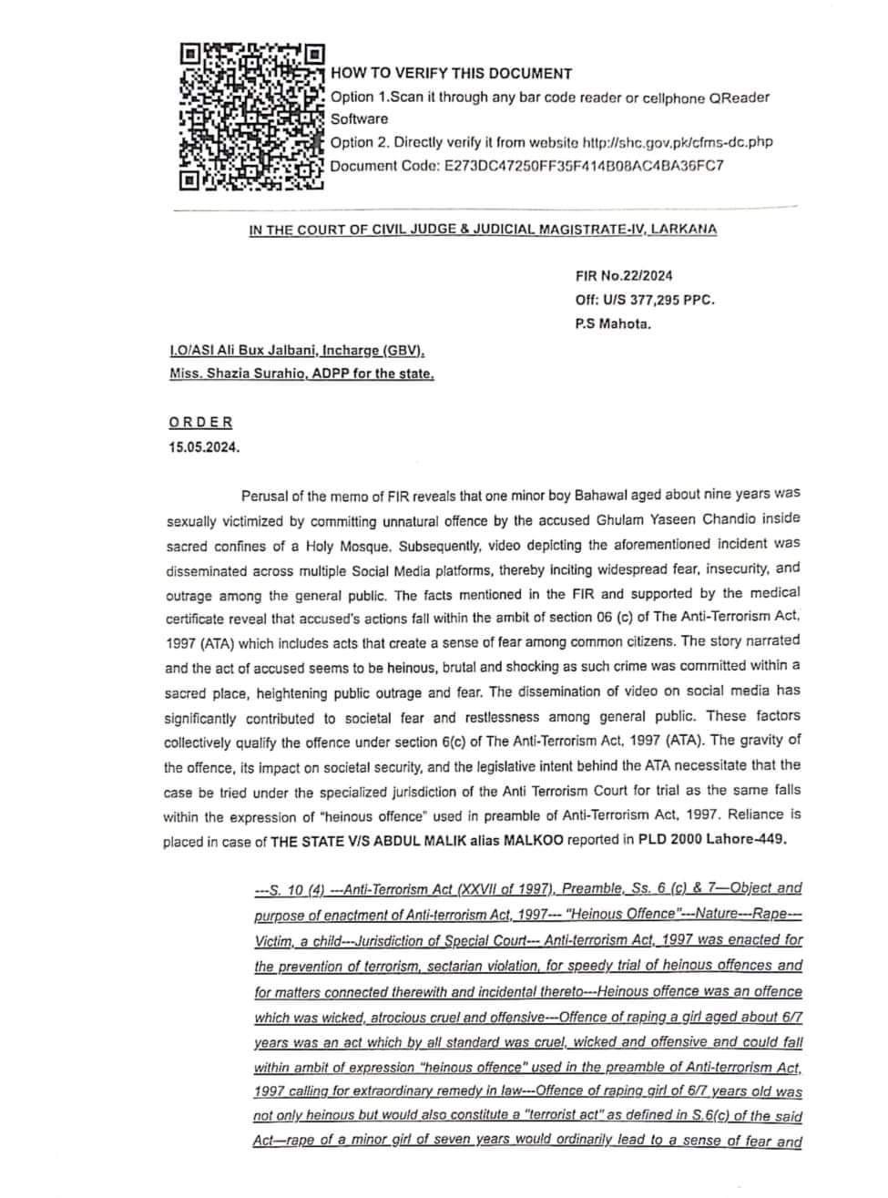 In a landmark verdict, the Larkana court, ordered to book cleric who raped a boy in the mosque, to book under terrorism charges.