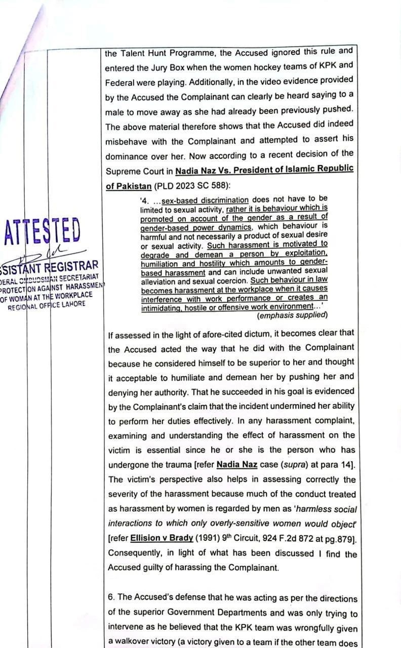 The federal ombudsperson has pronounced the director of sports of Sir Syed Engineering University guilty of harassing a woman official of the Pakistan Hockey Federation during the Prime Minister's Hockey Talent Hunt Programme.