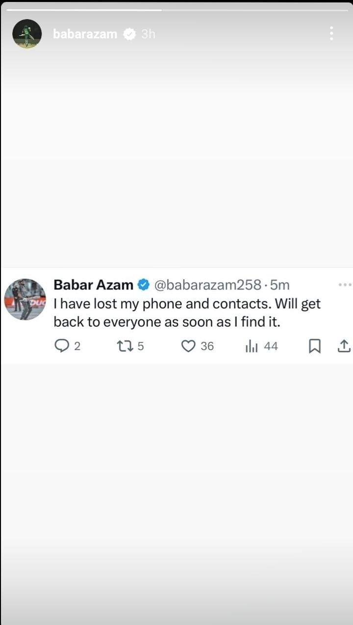 Former captain of Pakistan cricket team Babar Azam posted a story on his Instagram account to tell his followers about losing his phone.