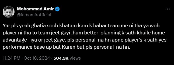 “Yar pls yeah ghatia soch khatam karo k Babar team me ni tha ya woh player ni tha to team jeet gayi (Please end these petty talks that the team won because Babar or other players were not in the team),” Amir wrote. He further explained, “Hum better planning k sath khelay, home advantage liya aur jeet gaye (We played with better planning, took the home advantage, and won).”