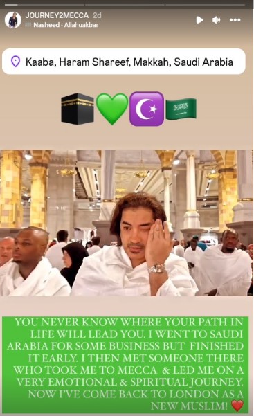 He shared a video of himself performing Umrah at Masjid al-Haram in Mecca, with the caption: "You never know where your path in life will lead you. I went to Saudi Arabia for some business but finished it early. I then met someone there who took me to Mecca and led me on a very emotional and spiritual journey.”