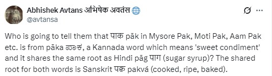 Indian linguist Abhishek Avtans took to X to clarify the origin of the term "Pak" in these sweets.