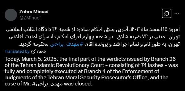 Iranian singer Mehdi Yarrahi was flogged 74 times as punishment for supporting the widespread protests in Iran against the hijab, which were partly inspired by his song during the 'Woman, Life, Freedom' movement, according to his lawyer.