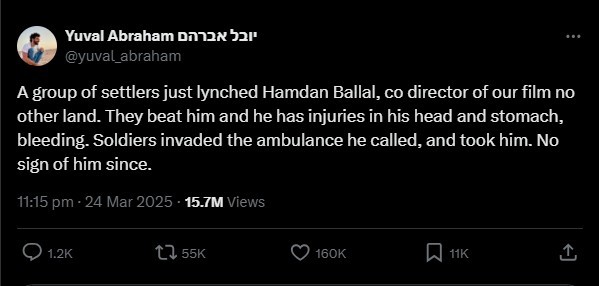 “A group of settlers just lynched Hamdan Ballal, co-director of our film No Other Land. They beat him, and he has injuries in his head and stomach, bleeding. Soldiers invaded the ambulance he called and took him. No sign of him since,” he wrote on X.