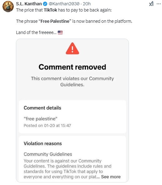 Several TikTok users took to social media to complain that the platform removed comments containing phrases like "Free Palestine," labeling them as violations of community guidelines, including hate speech.