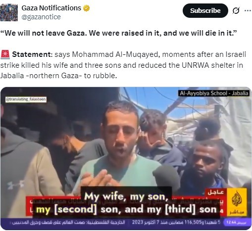 Mohammad Al-Muqayed was in Jabalia when an Israeli airstrike killed his family. Overcome with grief, he still spoke to journalists, expressing unwavering determination to stay rooted in Gaza.