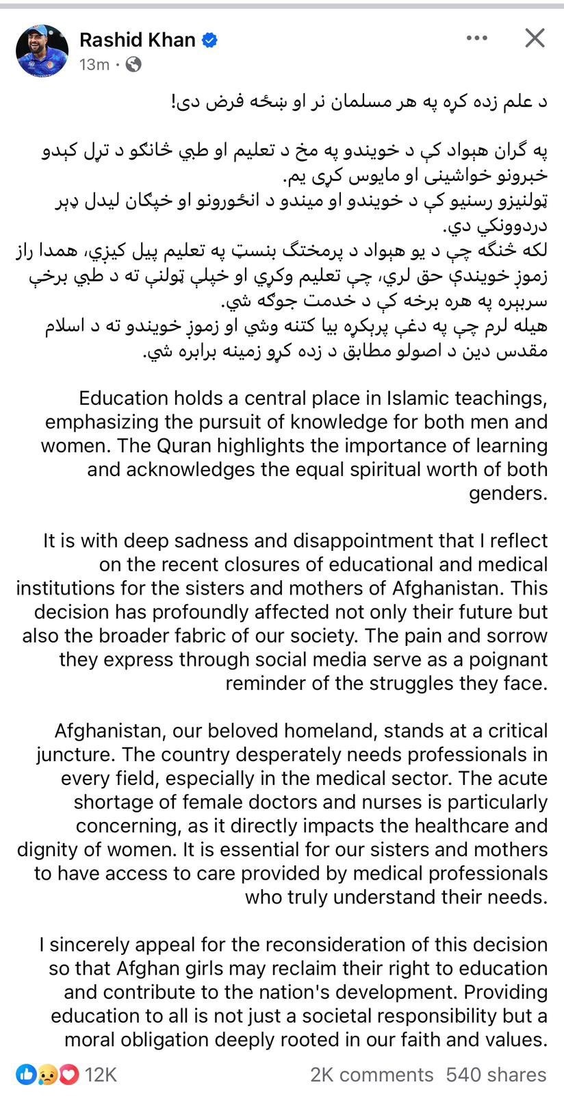 Rashid Khan's statement came a week after the Taliban government in Afghanistan further tightened its grip on women's education by closing one of the last remaining avenues for learning.
