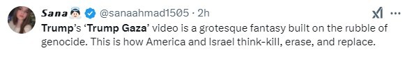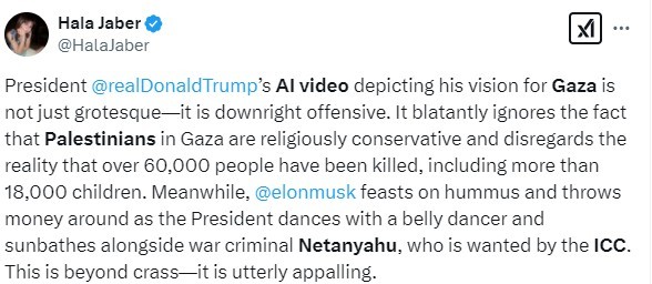 "President Donald Trump’s AI video depicting his vision for Gaza is not just grotesque—it is downright offensive. It blatantly ignores the fact that Palestinians in Gaza are religiously conservative and disregards the reality that over 60,000 people have been killed, including more than 18,000 children," journalist Hala Jaber said on X.