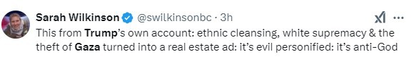 She added, "Meanwhile, Elon Musk feasts on hummus and throws money around as the President dances with a belly dancer and sunbathes alongside war criminal Netanyahu, who is wanted by the ICC. This is beyond crass—it is utterly appalling."