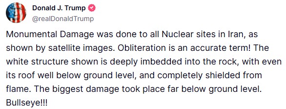 “Monumental damage was done to all nuclear sites in Iran, as shown by satellite images. Obliteration is an accurate term!” Trump wrote on Truth Social platform.