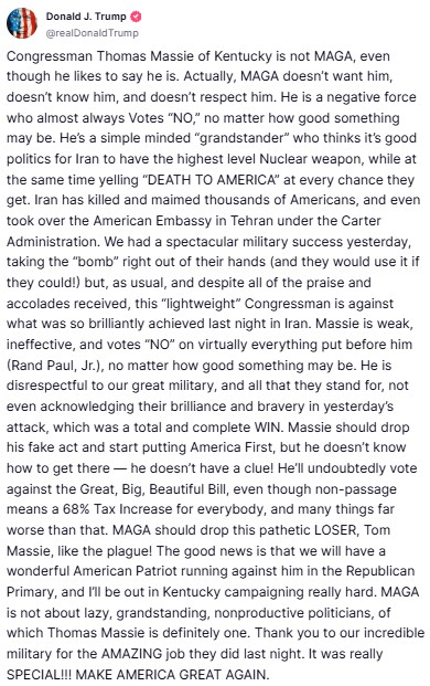 “We had a spectacular military success yesterday, taking the “bomb” right out of their hands (and they would use it if they could!),” he wrote on the Truth Social platform while criticising Thomas Massie.