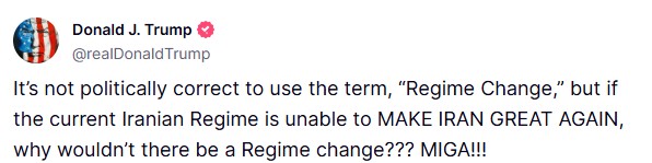 Trump shared a post on the Truth Social platform where he said, “It’s not politically correct to use the term, “regime change,” but if the current Iranian regime is unable to MAKE IRAN GREAT AGAIN, why wouldn’t there be a regime change??? MIGA!!!”