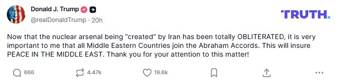 “Now that Iran’s nuclear weapons stockpile has been completely eliminated, it is very important to me that all Middle Eastern countries join the Abraham Accords,” Trump wrote on his Truth Social platform.